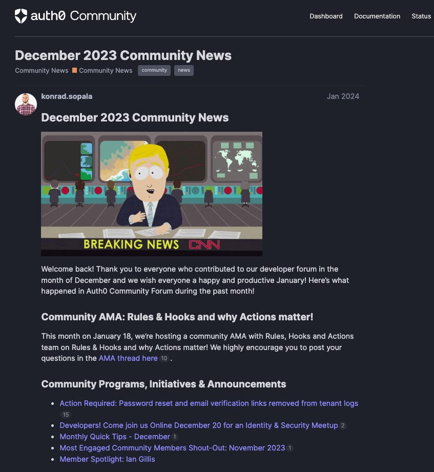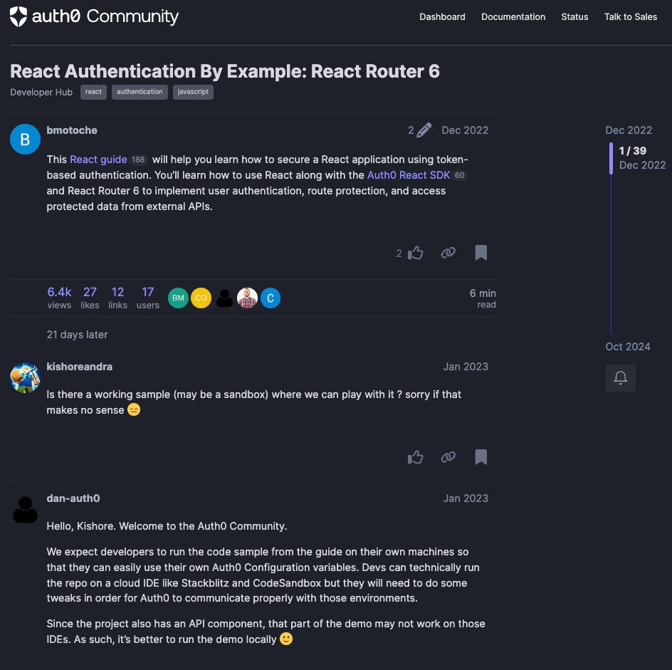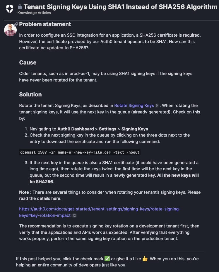 Another common challenge is repetition. Developers often ask questions without first checking if they’ve been answered before. That’s where FAQs - or what we called ‘knowledge solutions’ at Auth0 - proved valuable. These resources typically follow a simple format: problem statement, cause or symptoms, and solution. And they work best when hosted in a dedicated space within the community.