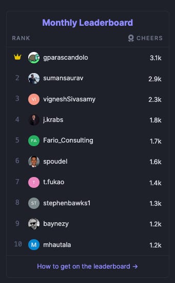 Next week, I’ll kick off a mini-series on the two most popular platforms: Discourse and Discord. We’ll start with an article and an open-source repo containing copy-paste PostgreSQL queries you can run in Discourse for tracking brand-awareness, activation, and retention metrics. The week after that, we’ll dive into Discord. See you there!
